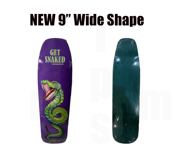 The Snake shaped skateboard deck is now available in a new 9" wide shape. A great deck for skating transition and cruising! All orders come with a free sheet of griptape.
